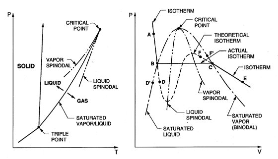If we were to actually measure the PVT behavior of a sample during phase change, we would continue to cool or heat the fluid past what we thought of as the saturation pressure or temperature. Phase change is inherently an unstable process. Once we cross into the phase change region our sample is in a metastable point — it should be theoretically unstable and not in equilibrium, but we can hold the sample like this for so long that we can still take measurements. This metastability continues until we reach the liquid or vapor spinodal lines. The spinodals usher in the unstable phase and the fluid with flash to the other spinodal.