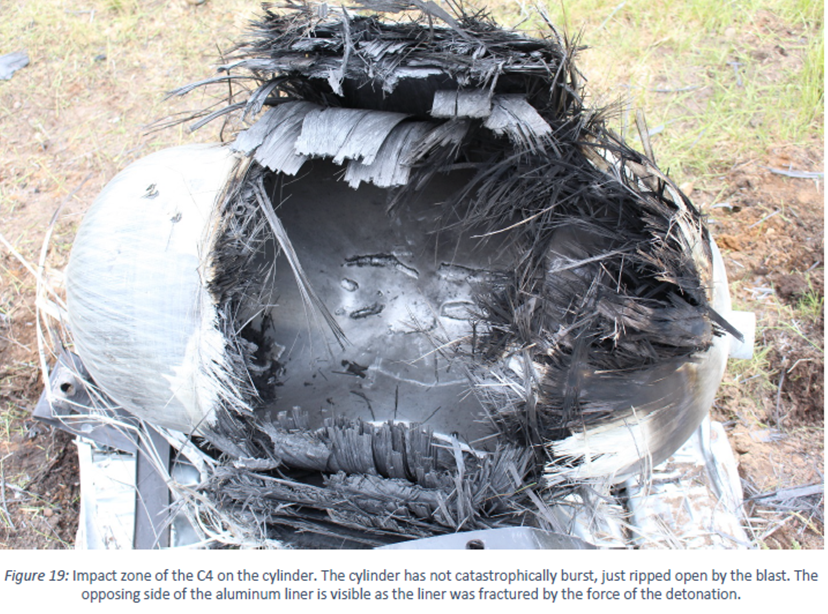 In this final case the biggest danger was shrapnel from the aluminum liner. The final sentence of the report concludes, “Storing the hydrogen at pressure will not cause any more significant safety issues than liquid fuel in the event of a ballistic penetration or explosion due to the inherently safe design of the storage systems.”