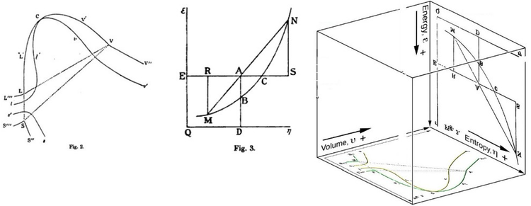 In the late 1800’s, thermodynamic researchers were trying to develop these “surfaces of state” for any simple fluid, even water. Around this same time, Kelvin, Maxwell, Helmholtz, and Gibbs were all trying to merge and resolve the first law of thermodynamics (balancing energy), and the second law of thermodynamics (balancing entropy). It was Gibbs, working in near isolation at Yale, that had the spatial-graphical understanding to merge the two laws with the fluid surface.