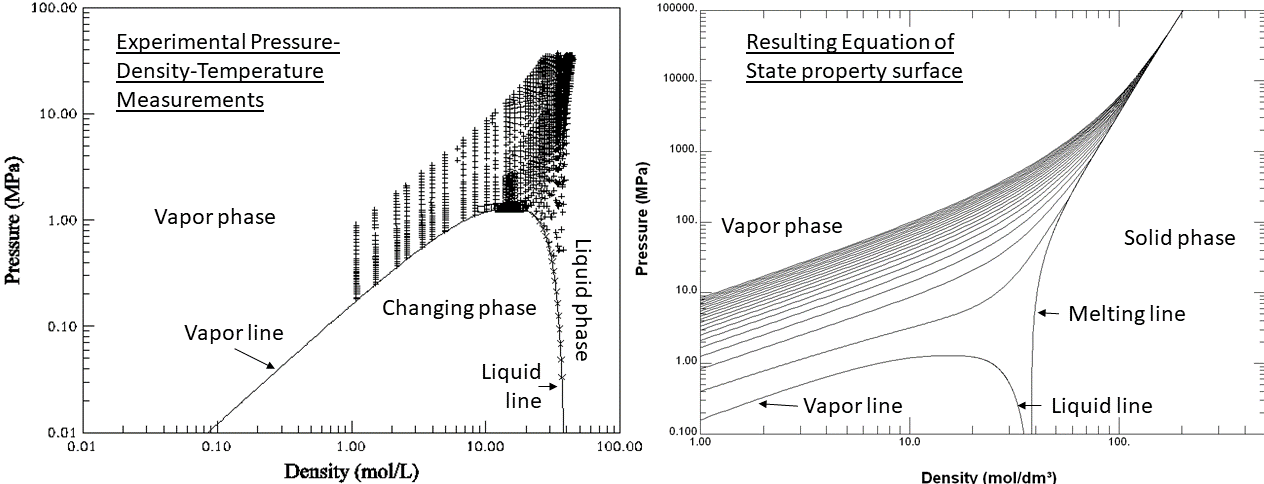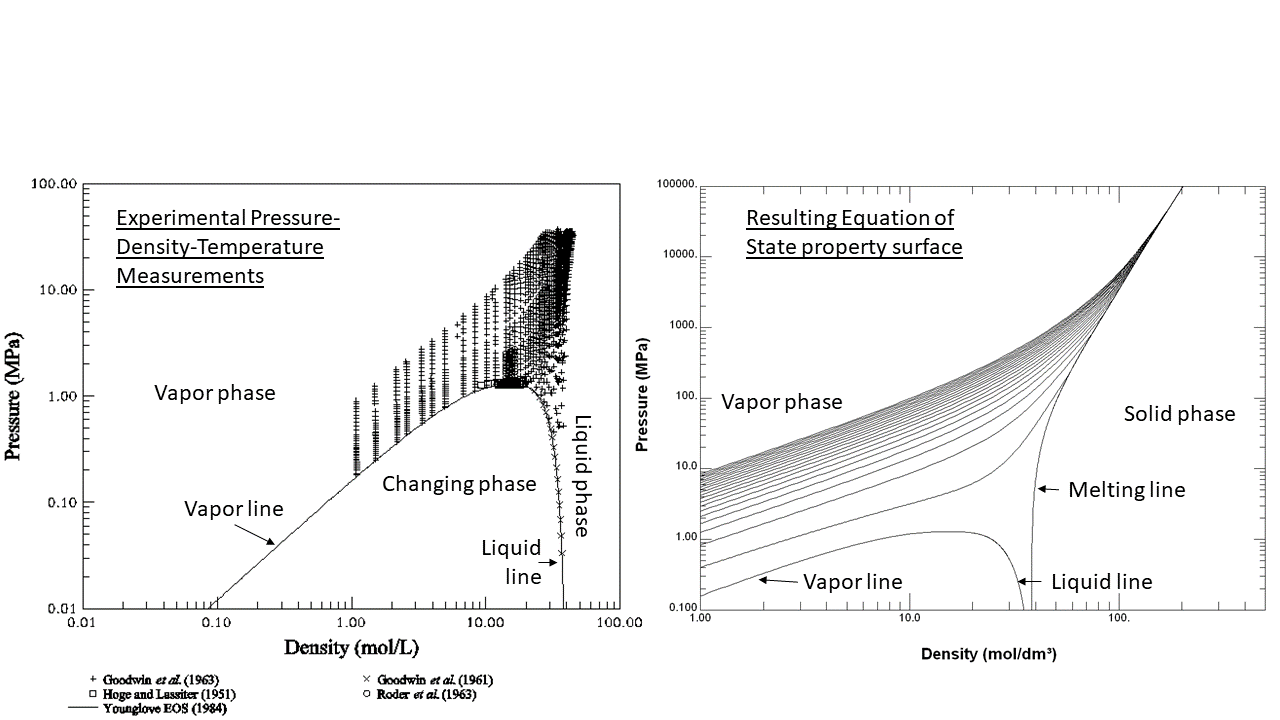 Another way to think about my thesis is to consider equations of state as topographical maps — the kind that show elevations to help you to navigate a mountain on a backpacking trip. Equations of state connect all of the thermodynamic properties in a single equation that fits the ‘mountain’ that is the fluid surface — and all fluids have one. Here are a couple of plots from my thesis. The plot on the left shows the “mountain” that divides the vapor from the liquid region, with phase change in between. Above the mountain are the experimental measurements of pressure-density-temperature, in this case taken at constant density. The plot on the right shows lines of constant temperature predicted by the equation of state I developed. This plot also includes the melting line that separates solid from fluid. From graphs like these you could engineer a system to run hydrogen at any practical temperature, pressure, or density.