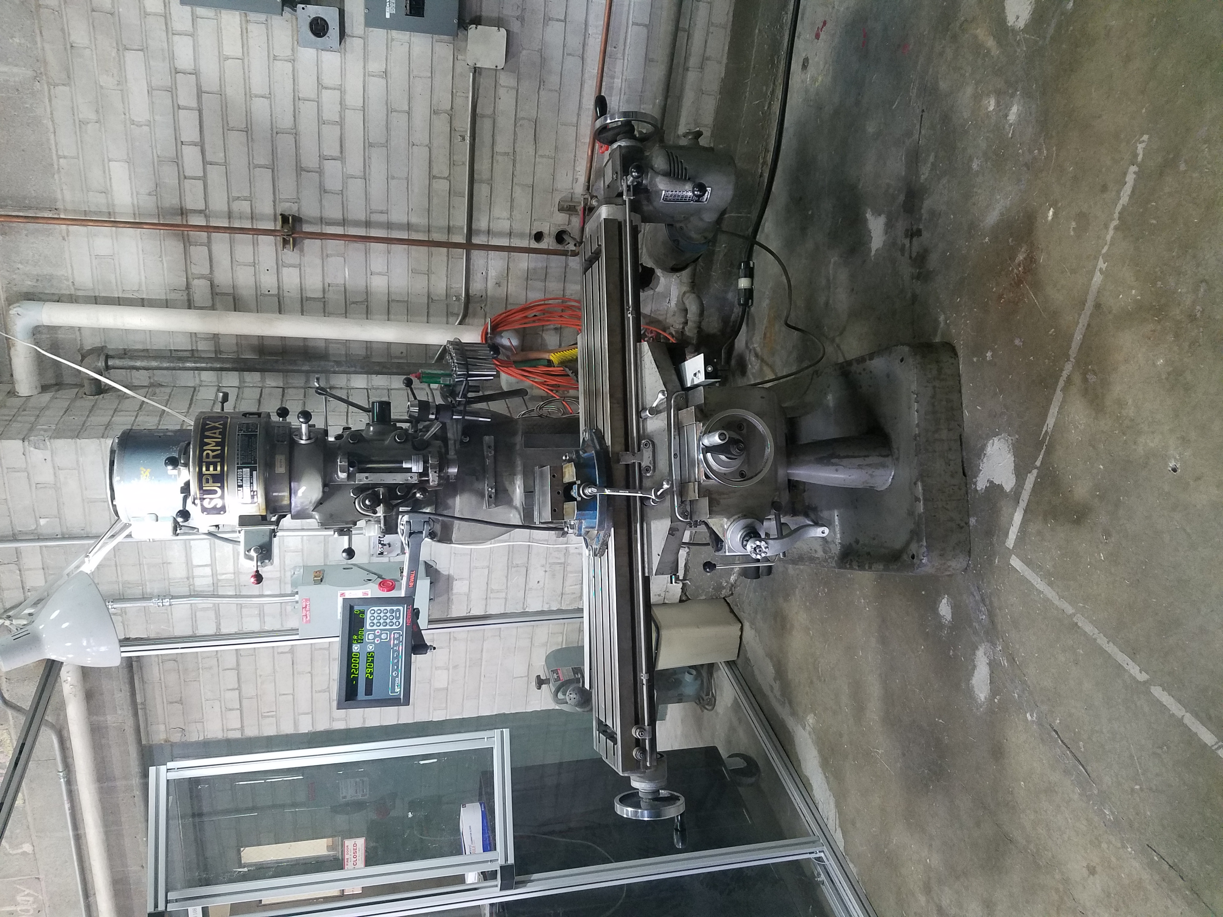 Collets are designed to be used with a specific cutting tool shank diameter allowing a much more secure fit than a drill chuck. Both endmill bits as well as drill bits are usable with the appropriately sized collet allowing for either drilling or horizontally fed workpieces. To mount a collet and endmill, the collet should be tightened onto the quill loosely at first without the endmill inserted. After the collet is loosely connected to the quill the endmill should then be inserted so that the cutting surface is fully outside of the collet while being supported by your hand to prevent dropping the endmill onto the mill bed. The quill is then hand tightened until the mill bit will no longer drop out, and at this point the spindle brake can be used to allow the quill to be tightened completely with the wrench stored on the machine. For a simple video showing this process and some information on mounting types see here.