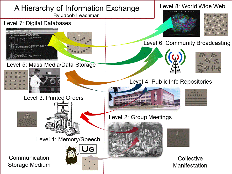 What you can see from the figure above is that each information storage mechanism works for a particular spiral value meme (which the corresponding network maps are from): 1. Survival, 2. Tribal, 3. Authoritarian, 4. Legalistic, 5. Performance, 6. Communitarian, 7. Systemic, and 8. Global/Holistic. Remember that all of the mechanisms/value levels matter and are useful in specific situations, yet evolved to serve differing needs through time. Each one of these information diffusion mechanisms likely has it’s own diffusivity property; similar to the mass, momentum, chemical, thermal, and electrical diffusivities in traditional thermodynamic space. It’s going to take some work to calculate these information diffusivity values for every instance or case.