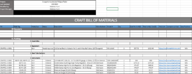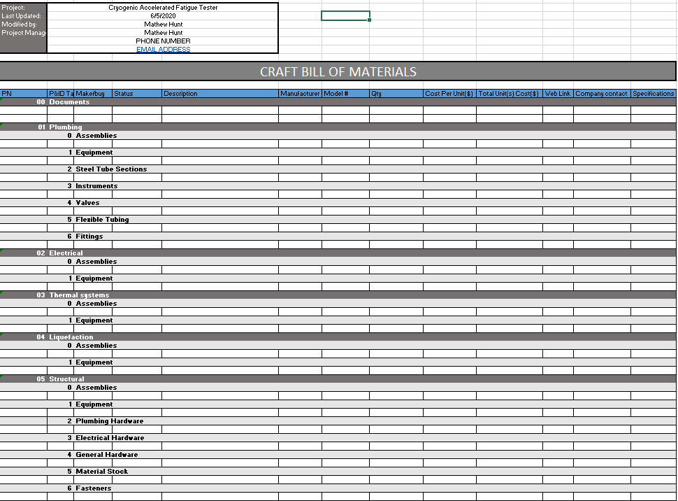 As the project manager and lead graduate student with the CRyogenic Accelerated Fatigue Tester (CRAFT), having a process for part procurement has been the key to avoiding headaches in the final stages of system assembly. As an engineer, a Bill of Materials (B.O.M.) has been the simplest and most informative way of handling this process.
