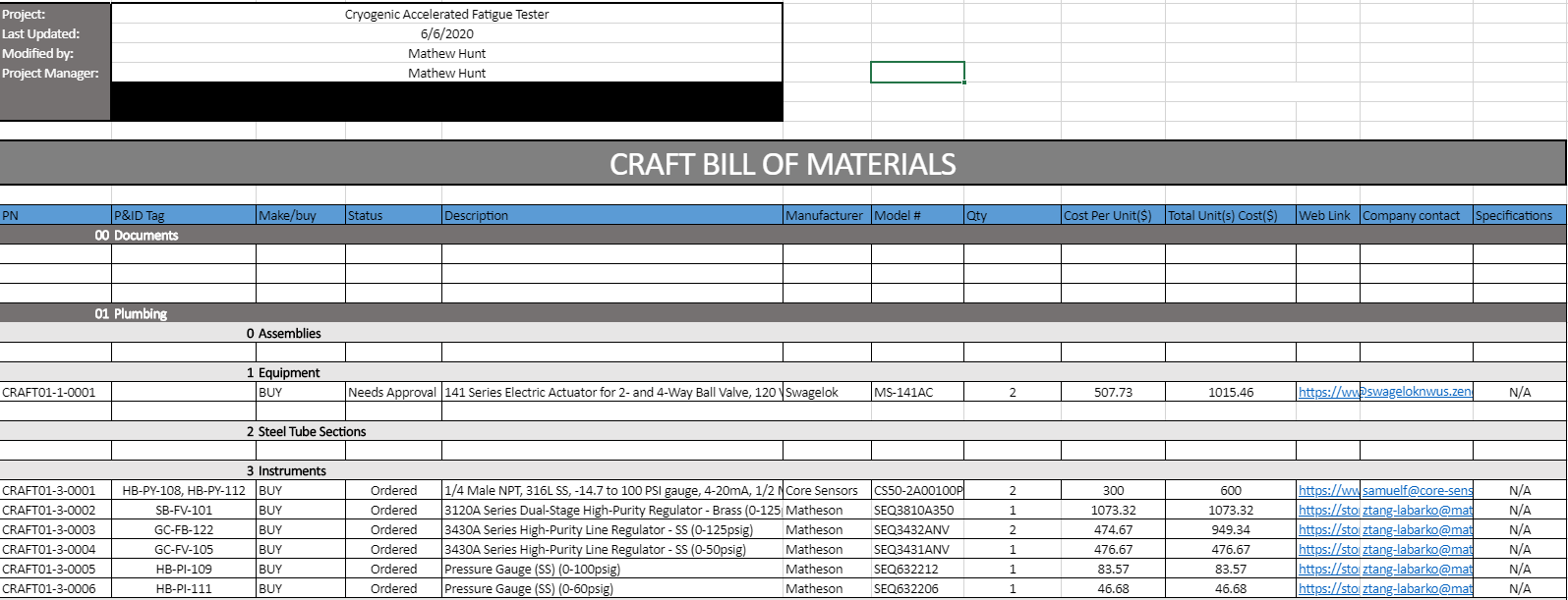 Each part purchased is given a unique serialized identifier that is organized by part type and subtype. These parts are then given an associated tag that references its location on the system’s Piping & Instrumentation Diagram (P&ID). Furthermore, all the relevant information that identifies the part and its manufacturer is kept on file, with accrued costs in acquiring it. Lastly, the status of the part is maintained as to keep a real-time record of the parts travel from purchasing to receiving. An example of this can be seen below: