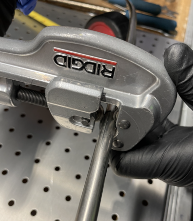 Once you have the measurement, take the line, measure it, and mark with sharpie where the desired cut will be. Taking a tube cutter, place the line between the roller and blade of tube cutter. Align blade with inside of marked line.