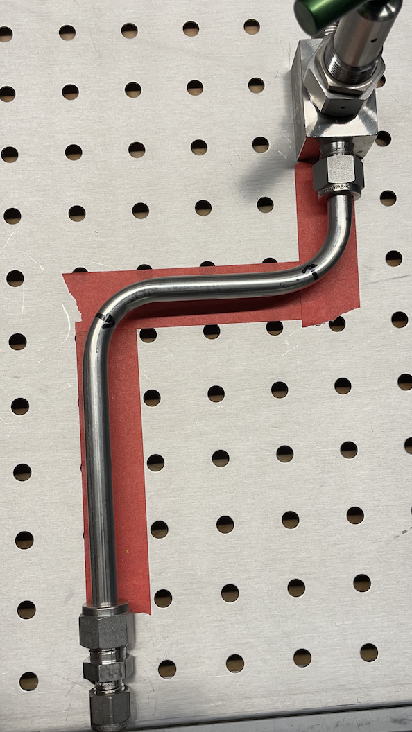 When structuring a manifold, it is helpful to reduce the amount of overlap with lines. Try to centralize each type of line in its own respective region if possible. The sections can be color-coded by placing colored tape on the base of the board. This will help with operations and allow for a more user-friendly interface. Taping your manifold out also helps in reducing the amount of build error, time, and components (so money) when building a manifold since it can act as a guide for cuts and bends.