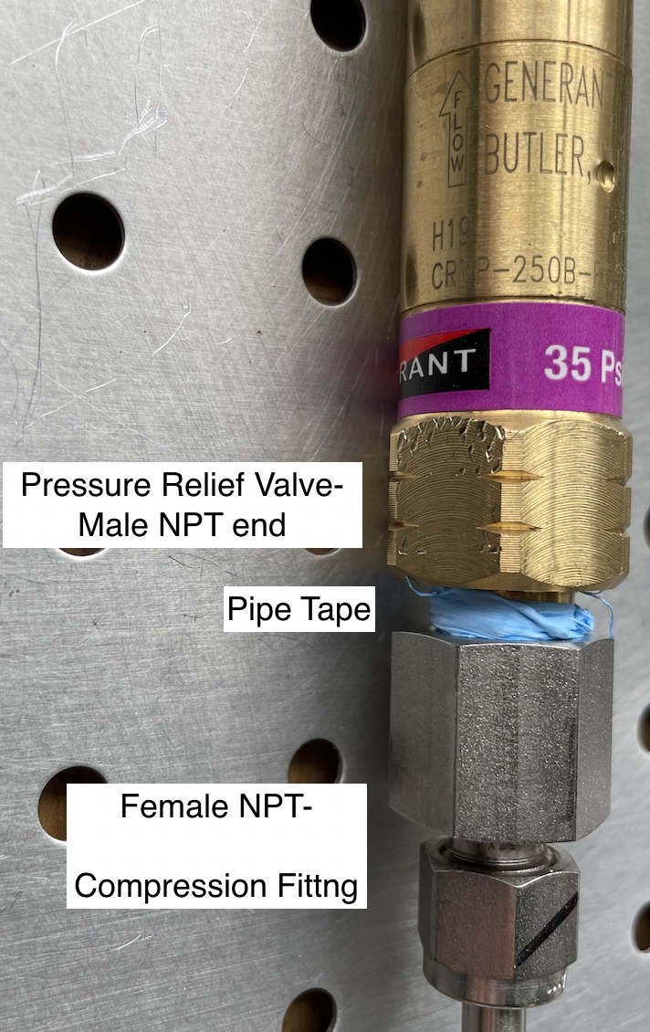 The second most common type of fitting used in the lab’s plumbing manifolds are NPT fittings. These consist of a male and female counterpart with a threaded insert where pipe tape is added and tightened with a wrench. This is another method of joining components such as pressure relief valves which commonly have a male NPT on each end so must be joined with a female NPT to compression fitting.