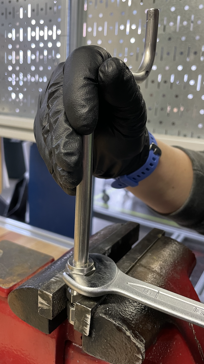 Once all components are checked and in place, while holding the line straight vertically with one hand, using the other hand, screw the nut clockwise to be hand tight. Then take the wrench and insert onto the nut. Make note of what orientation you are starting with the wrench. The rule of thumb for swaging is you want to go one full revolution clockwise then ¼ revolution more. So if you start in the 6:00 position, do one full revolution to end in the 6:00 position first then go further to the 9:00 position.
