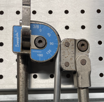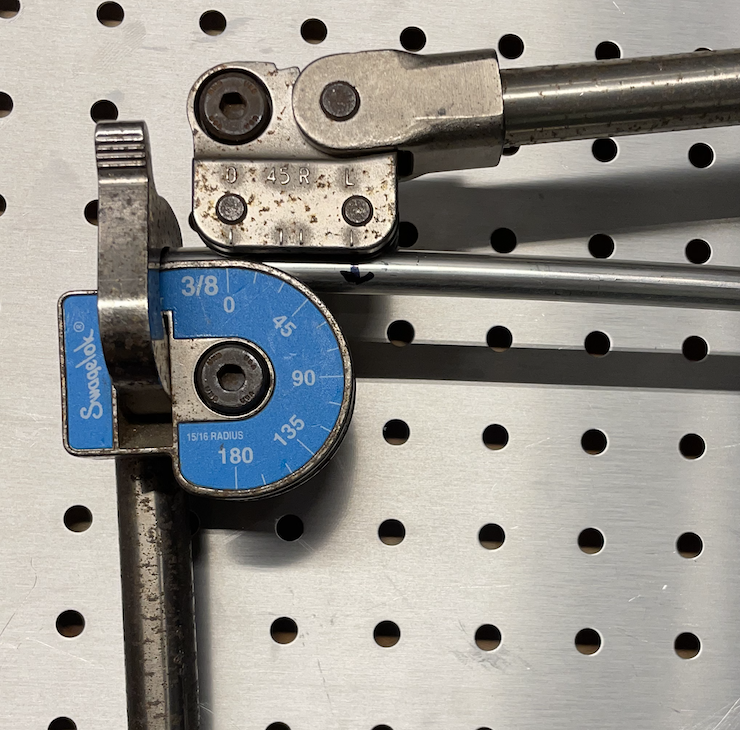 Using the 3/8” Swagelok Bending tool, insert the line into the groove, loosely clamp the tube latch so the tube will not fall but remain loose enough for movement. Make sure short handle sits above the line and is parallel with the line and long handle with the name plate is perpendicular to the line.