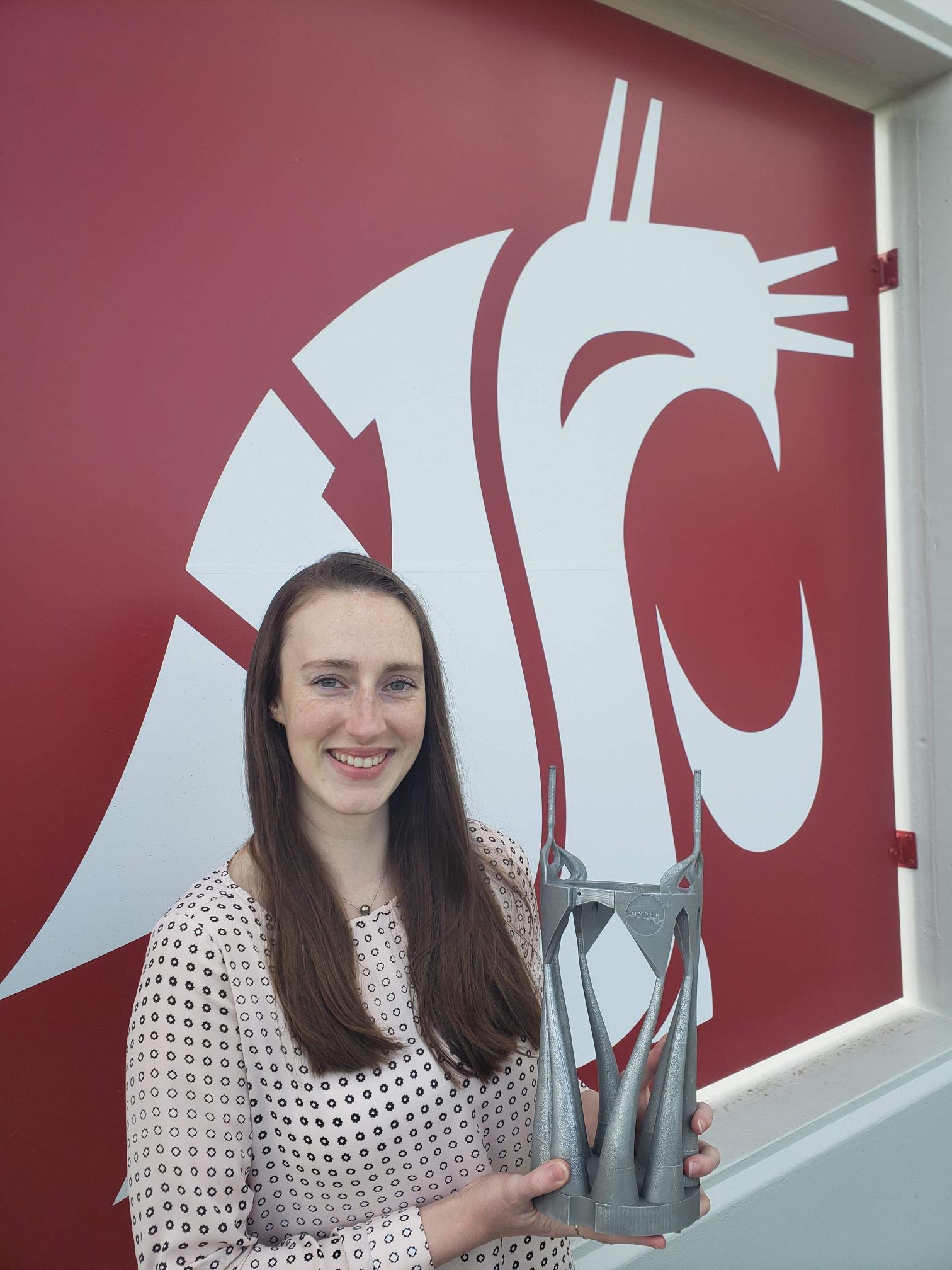 Jordan Raymond and her 3D printed hydrogen liquefier heat exchanger (credit to Lane Pesek for assisting in the CAD modeling).