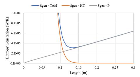 Whether the flow is laminar or turbulent makes some differences but the two rules above remain. Plotting these generation mechanisms versus length for a fixed tube diameter leads to an interesting optimization problem. Jordan created the following graph for a tube of 1.27 cm inner diameter with a 200 K hydrogen flow at 0.093 g/s. You can see that both of the entropy generation mechanisms are plotted with a minimum total entropy generation appearing near 13 cm in length. This means that for a fixed tube diameter, going any longer or shorter than this length with result in decreased heat exchanger performance. So is that it? Are we stuck? What happens next?